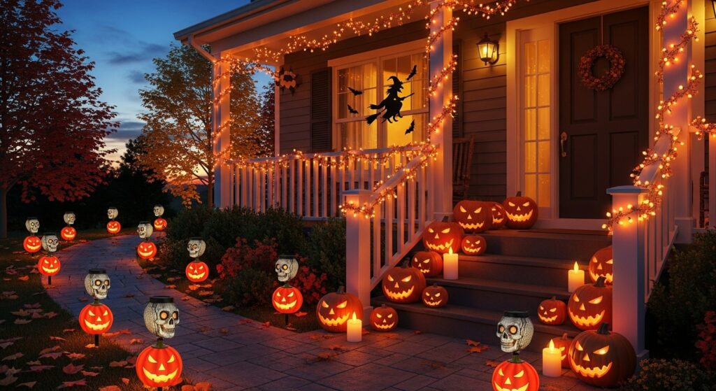 Use multiple layers—pumpkins on steps, hanging bats from railings, and lanterns along the walkway. Vertical space adds drama.