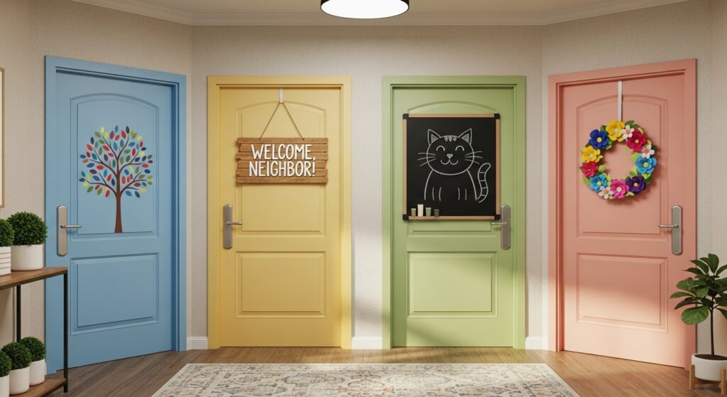 Opt for removable decorations like decals or door signs. Keep it friendly and considerate for neighbors.