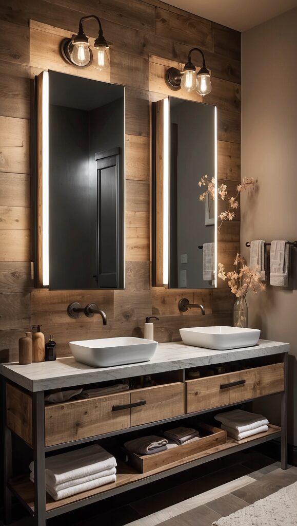- Reclaimed wood vanities or shelving