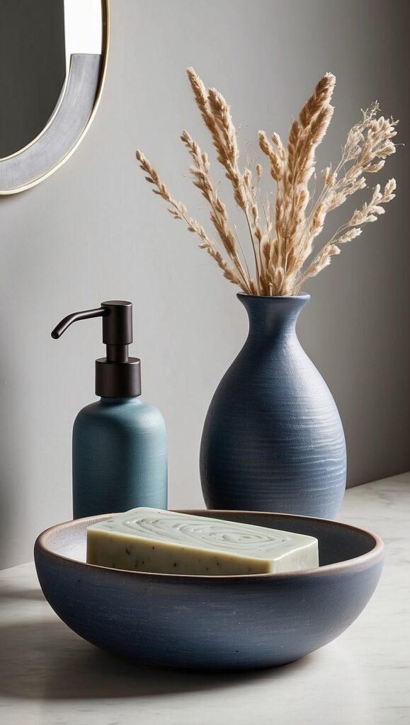 - Polished countertops with handmade ceramic accessories