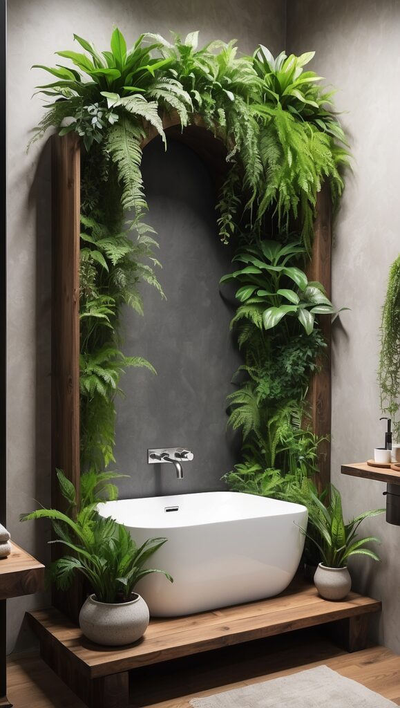 Greenery adds life, texture, and a spa-like feel, enhancing both modern minimalism and rustic warmth.
