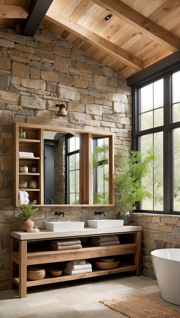 Rustic design is deeply rooted in nature, so incorporating natural materials is one of the easiest ways to add warmth and authenticity to a modern bathroom.