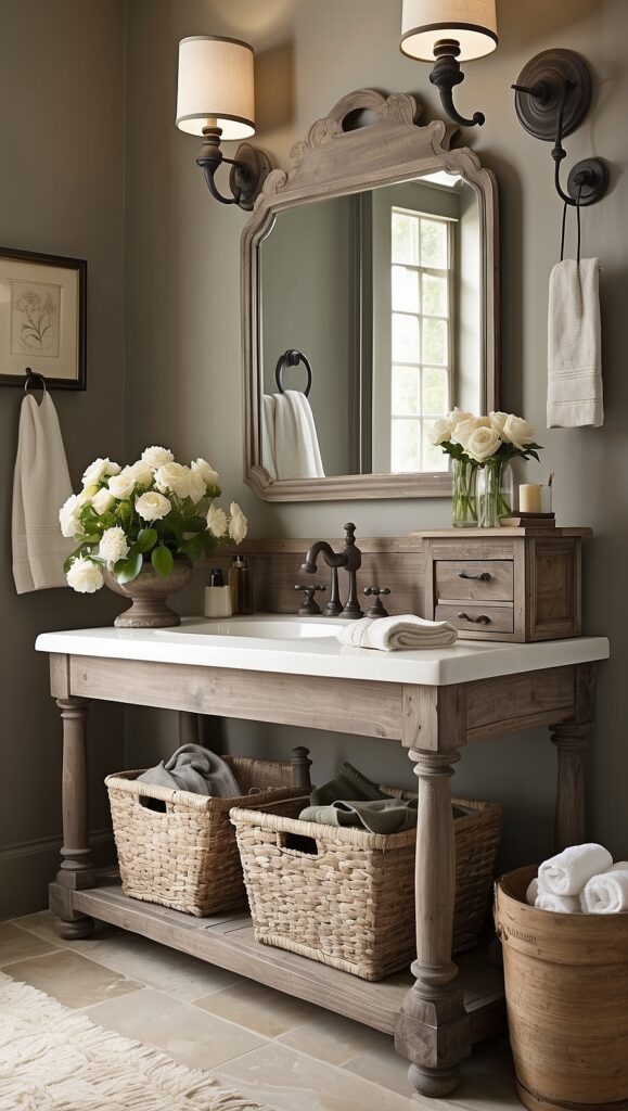 Instead of traditional bathroom cabinetry, repurpose vintage or rustic furniture.