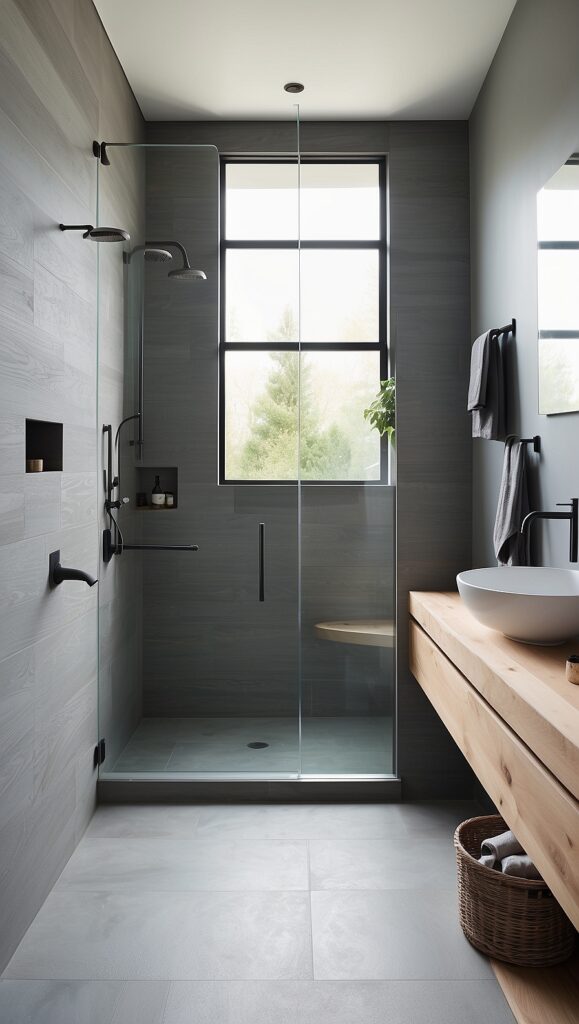 - Sleek glass shower enclosures with textured wood walls