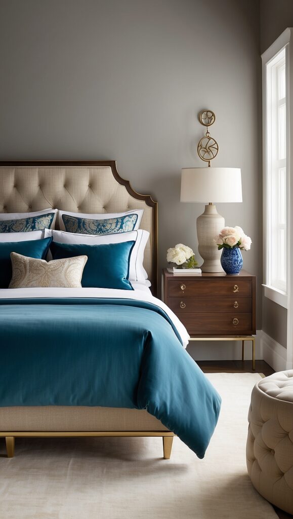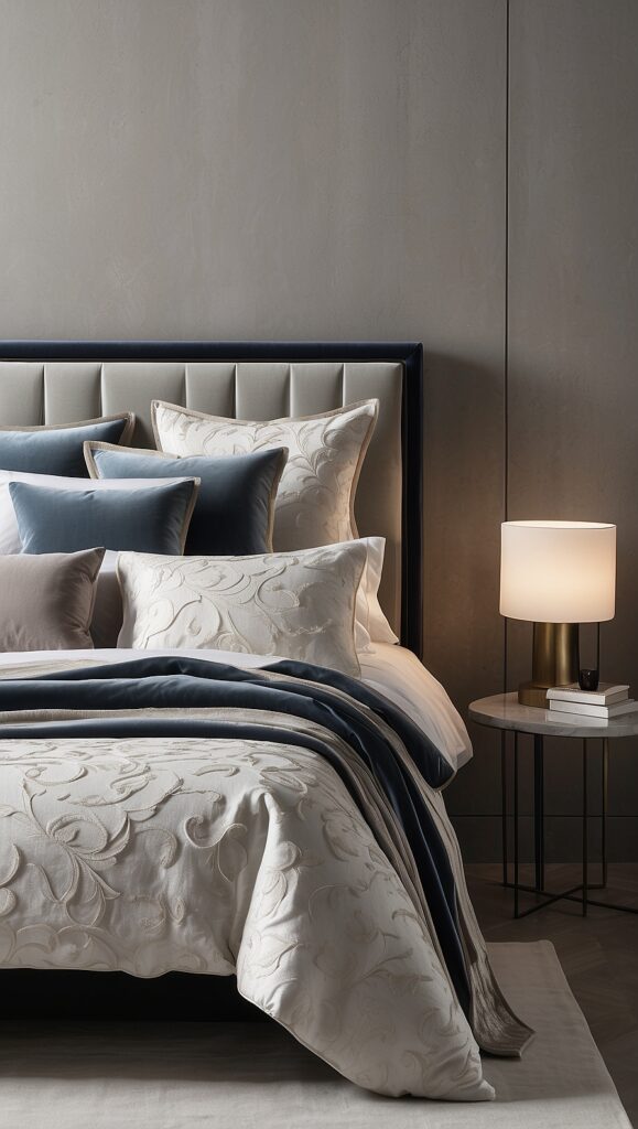 For example, a velvet headboard, a linen duvet, a wood nightstand, and brass lighting can work together to create a layered and refined atmosphere.