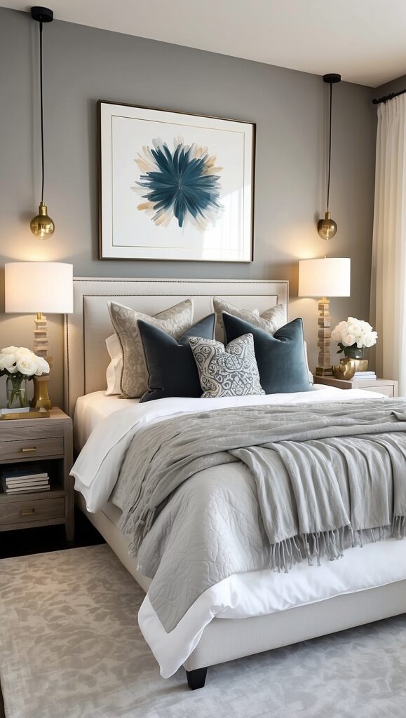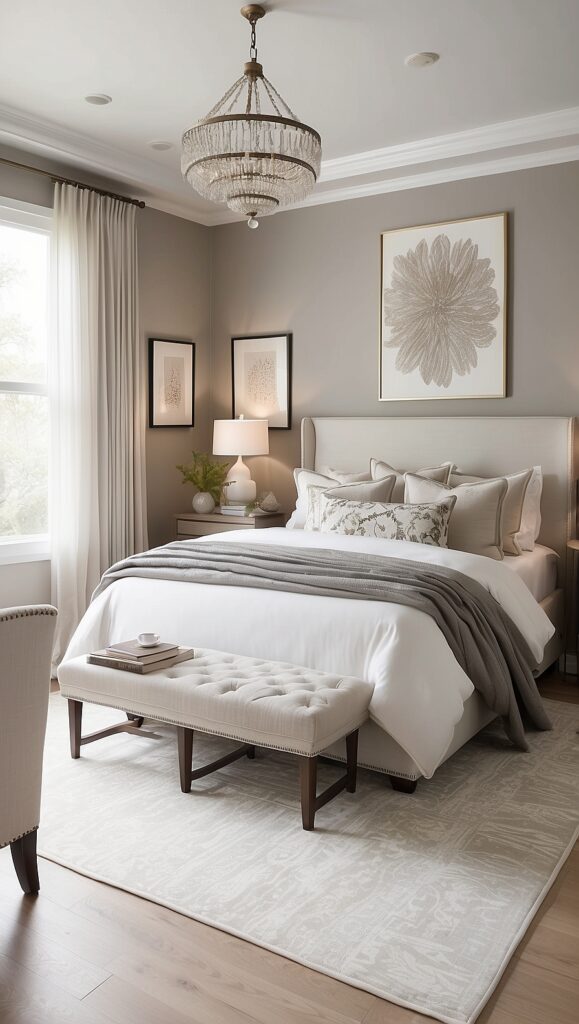 A chandelier above the bed, sculptural bedside lamps, or pendant lights can dramatically enhance the room’s elegance.