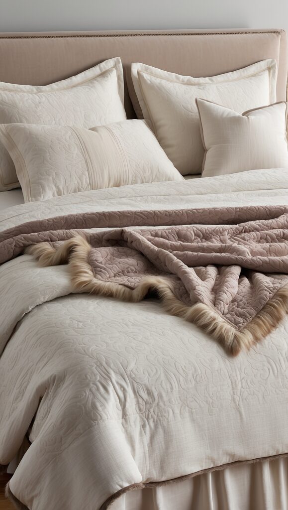 Combining fabrics such as linen, velvet, faux fur, silk, and cotton creates a rich and inviting bed arrangement.