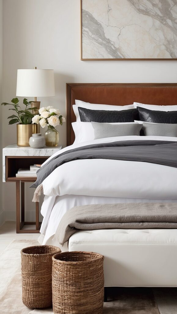 Even small touches—like a leather bench at the foot of the bed or a woven basket—can enhance the layered design.