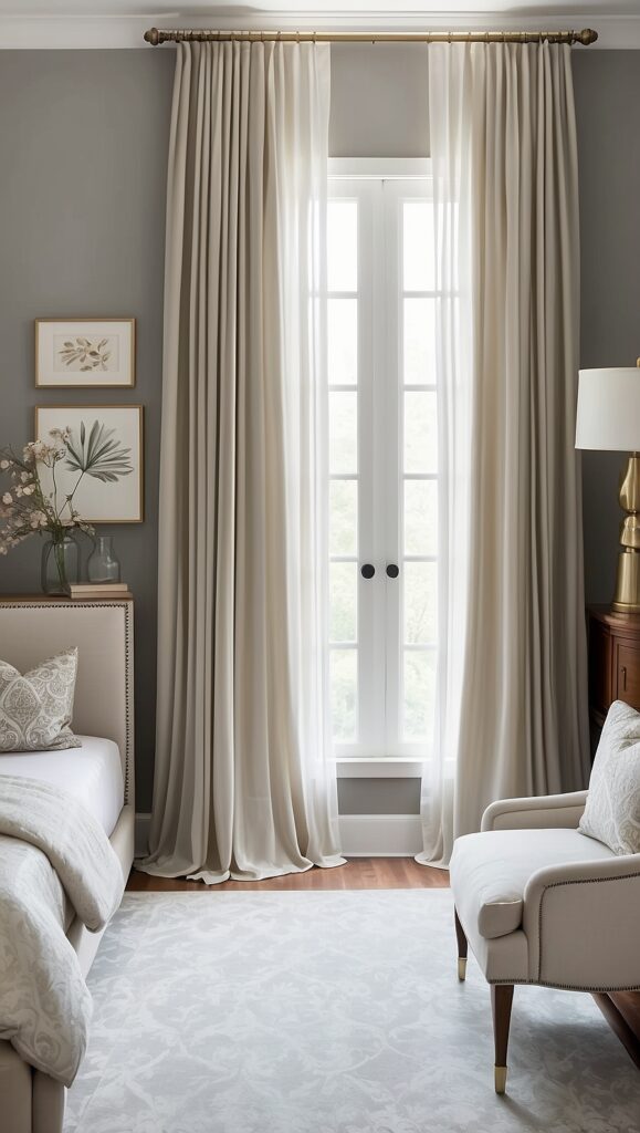 Long curtains visually heighten the room and create a dramatic, elegant effect. Pairing sheer curtains with heavier drapes allows natural light during the day while maintaining privacy at night.