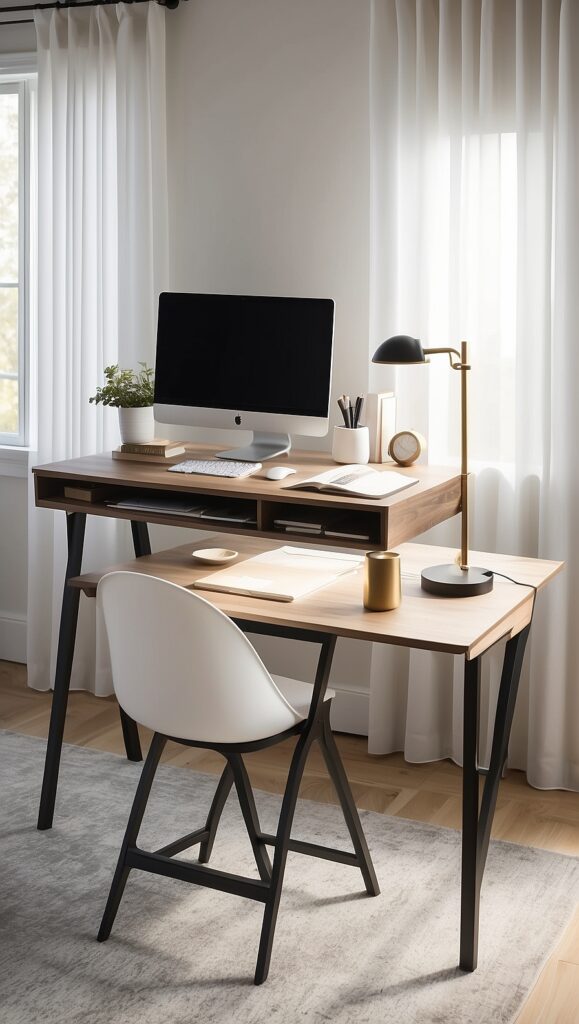 Position your desk near a window if possible. Natural light improves mood and reduces eye strain. Use sheer curtains to diffuse harsh sunlight while maintaining brightness.