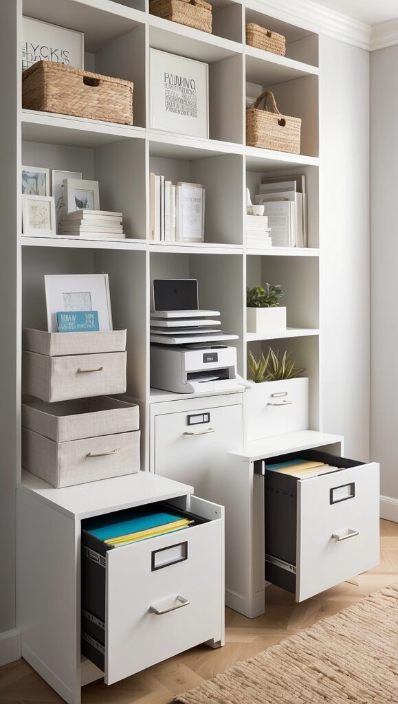 Modern filing cabinets come in sleek finishes like matte white or wood veneer. They can double as side tables or printer stands.