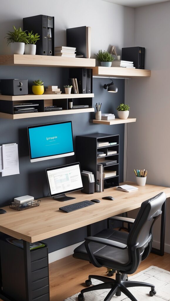 Use drawers, shelves, or desk organizers to store documents, cables, and accessories. Cable management tools can help keep wires tidy and prevent clutter.