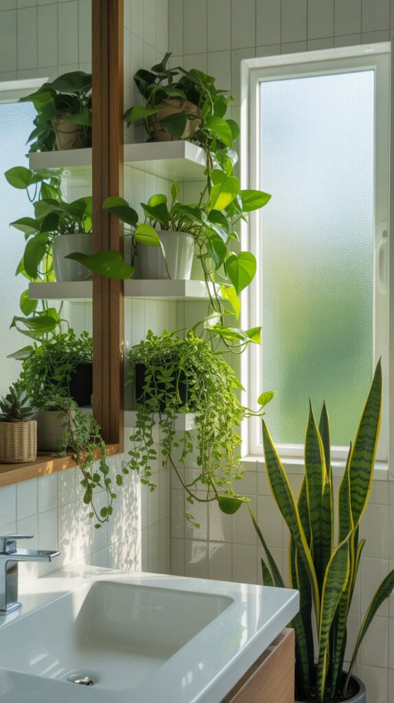 The contrast between soft leaves and rigid tiles adds depth and dimension to the space. Different plant shapes—such as spiky, trailing, or broad-leaf varieties—create layers of interest without overwhelming the design. This natural texture keeps the bathroom visually engaging while maintaining a clean and cohesive look.